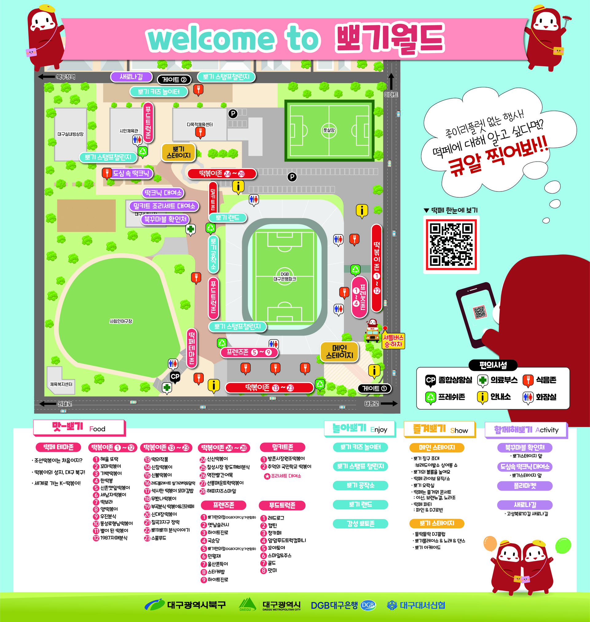 2024 떡볶이 페스티벌을 지도로 한눈에 보여드리겠습니다. 전체 지도와 각 구역의 테마를 확인하시고 동선 체크하시며 둘러보시기 바랍니다.