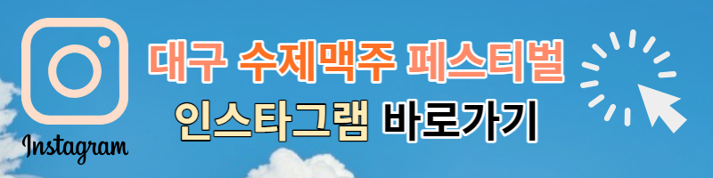 2023 대구 수제맥주 페스티벌은 인스타그램을 통하여 축제 소개와 이벤트 소식 등을 전하고 있으니 관심 있으신 분은 대구 수제맥주 페스티벌 인스타그램을 방문해 주시기 바랍니다. 아래 링크는 모바일로 보시면 더 편하게 보실 수 있습니다.