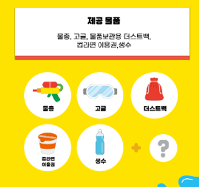 티켓을 구매하시면 물총, 고글, 물품보관용 더스트백, 컵라면 이용권, 생수가 제공됩니다. 또한 물품보관소 이용권과 탈의실 이용권도 제공된다고 하니 가성비 끝판왕 축제로 소문난 이유가 있네요. 이번 여름을 핫하게 보내실 분은 꼭 이 축제에 참여하셔야겠습니다.